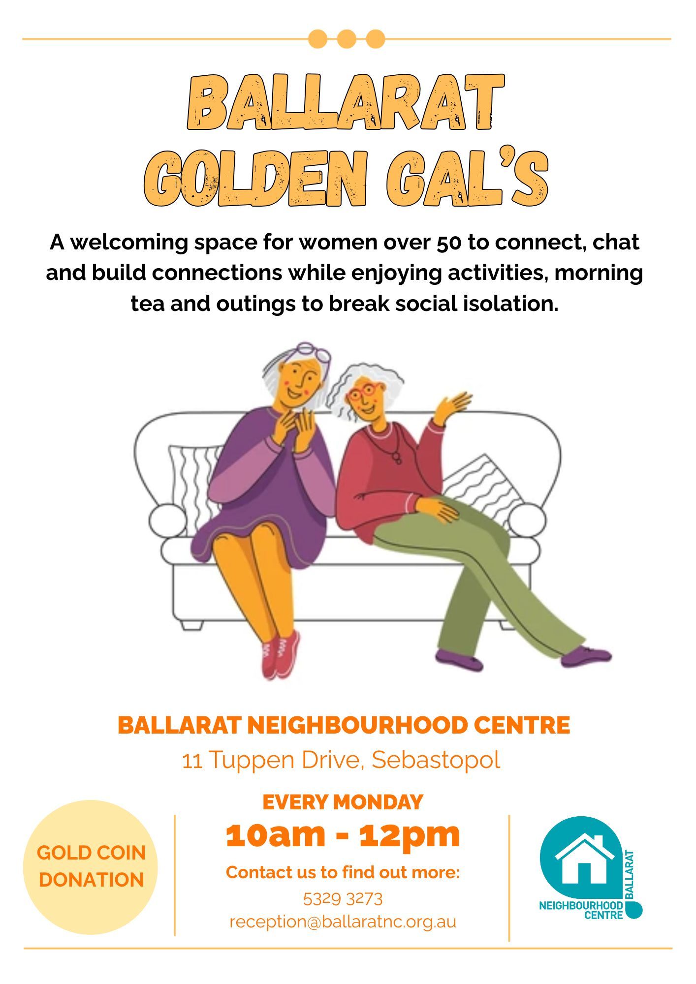 The Ballarat Golden Gal's is a welcoming social group designed for women over 50 years old. The group meets every Monday morning in a relaxed and safe environment, providing an opportunity for connection and friendship among members of the community.